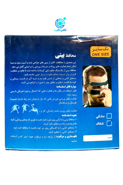 اين محصول با محافظت كامل از بينى هاى جراحى شده و آسيب ديده به شما امكان انجام فعاليت هاي روزانه و تمرينات ورزشى را در ايمنى كامل هى دهد محافظ بينى از بلاستيك مقاوم پلى كربنات ساخته شده تا علاوه بر شفافيت لازم در برابر ضربات محكم مقاومت بسيار خوبى داشته باشد.