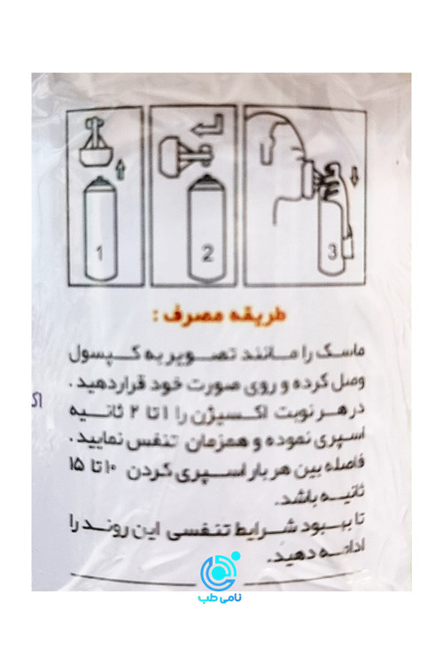 1. ماسک را به کپسول وصل کرده و روی صورت خود قرار دهید., 2. در هر نوبت اکسیژن را تا ۱ تا ۲ ثانیه اسپری نموده و همزمان تنفس نمایید., 3. فاصله بین هر بار اسپری کردن ۱۰ تا ۱۵ ثانیه باشد. تا بهبود شرایط تنفسی این روند را ادامه دهید.